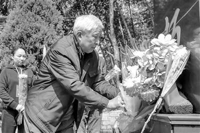 4月1日清晨,浙江省湖州市德清县阜溪街道龙山村80岁退休老教师蔡永法,从家里出发,步行20多分钟,来到有18位新四军牺牲战士安息的龙山茶山岭烈士陵园,进行修剪枝叶、擦拭碑牌及清扫地面等工作。至此,蔡永法已无怨无悔义务守护烈士陵园达半个多世纪,先后为到陵园祭奠英烈的人们讲解先烈的英雄事迹10多万次。图为蔡永法在烈士墓前献花祭奠。(小绍兴 摄)