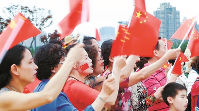 “快闪”活动中,人们挥舞手中旗帜唱出心中赞歌。 资料照片