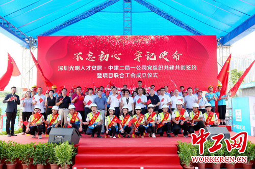 中工网讯(工人日报—中工网记者刘友婷 通讯员覃华莹)今年是新中国成立70周年,为深入贯彻习近平新时代中国特色社会主义思想和党的十九大精神,加强国有企业党建工作,9月17日,中建二局一公司与深圳人才安居集团旗下光明人才安居有限公司(以下简称“光明人才安居公司”)党组织共建共创签约暨项目联合工会成立仪式在长圳车辆段保障性安居工程二期项目隆重举行。深圳市总工会、建设工会领导,深圳市人才安居集团、中建二局领导,中建二局一公司等相关领导以及基层一线建设者共计百余人参加此次活动。