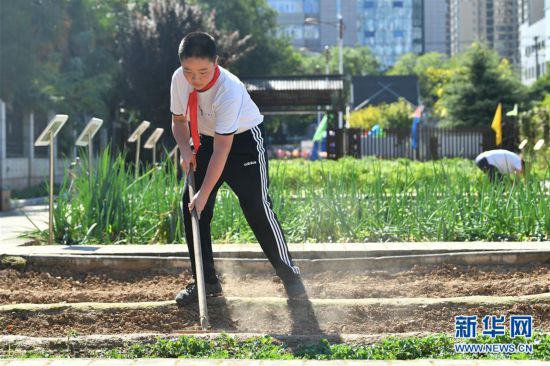 8月31日,学生在西安市小雁塔小学农耕劳动实践基地翻松耕地。新华社记者 张博文 摄