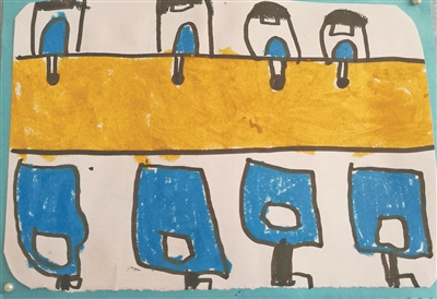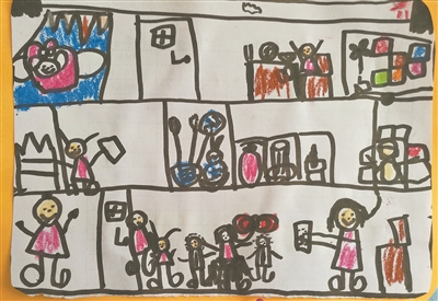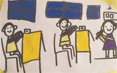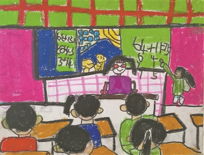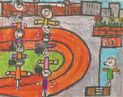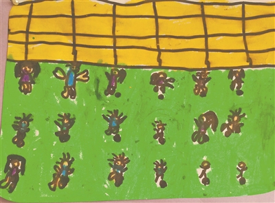 大班孩子马上要上小学了,为了让他们对小学有所了解,做好当一名小学生的准备,在大班最后一个阶段,我们设计了“我要上小学”的主题活动。孩子们带着新奇和憧憬参观了小学,他们被小学生整齐的校服、庄重严肃的升旗仪式、宽敞明亮的教室深深吸引。回到班里,他们将“我看到了什么”及“我的发现”画了下来。孩子们的作品,用色鲜明大胆,能突出表现细节,把自己看到的内容加入联想进行绘画,但他们似乎还不太能理解绘画中的遮挡关系,需要进一步引导。(本栏目图片由北京市大兴区第十幼儿园于舫、田丹、朱思佳老师提供)