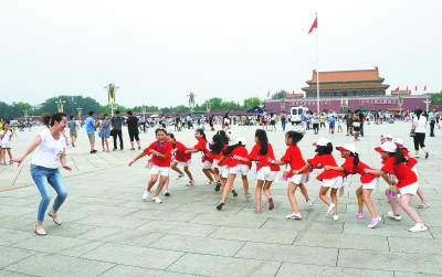 ▼参加夏令营的小营员们在天安门广场快乐游戏。