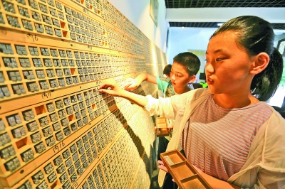 7月16日,山东省临沂市沂南县竹泉村,研学旅行的孩子们在“时光印记活字印刷体验馆”内体验活字印刷。暑假期间,各地的孩子们纷纷通过丰富多彩的形式“学艺”充电。新华社发