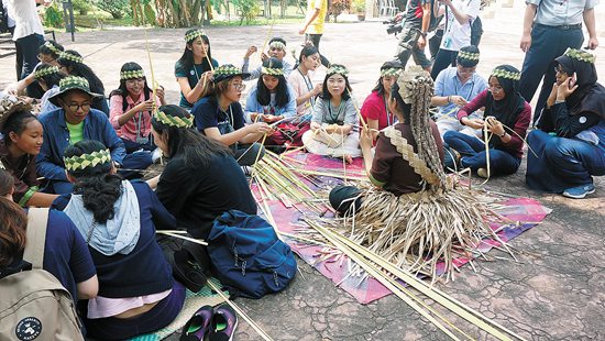 参加2018亚洲学生环境论坛的9国学生在向玛美里族人学习折叶艺术