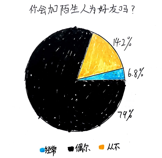孩子们在做网络安全调研的时候发现,79%的学生表示自己偶尔“添加过陌生人为好友”,表示“从不”“添加陌生人为好友”的仅为14.2%。