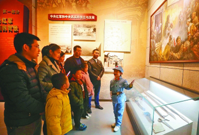 近年来,江西省于都县组织100余名小红星讲解员利用周末、节假日到中央红军长征出发地纪念园等红色景点,为游客义务讲解长征历史。图为12月9日,小红星讲解员在给游客讲述长征故事。方名荣摄/光明图片