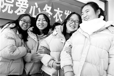 近日,江苏大学理学院学生开心地穿上新棉衣。随着天气变冷,该校开展“爱心冬衣温暖贫寒学子”活动,向全校20多个学院的1100名大一和研一贫困生免费发放冬衣。