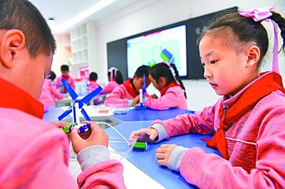 学生在创客教室体验电机如何带动齿轮转动。新华社发