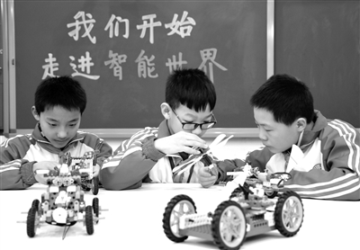 近日,在河北省邢台市桥西区南大郭小学创新实验室,学生在开学第一课上组装机器人模型。