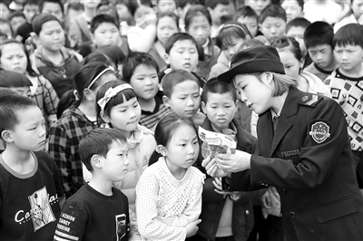 3月11日,四川省广安市市场监督管理局的执法人员在华蓥市阳和镇双碑村小传授假冒伪劣食品识别技巧。近日,该单位组织执法人员不留死角地分别深入辖区各村小,开展食品安全知识宣传和检查,确保学生食品安全。邱海鹰 唐仕元 摄