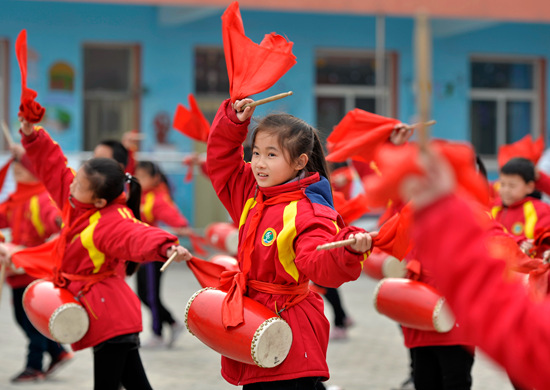 3月20日,百泉小学学生在练习打腰鼓。近年来,河北邢台经济开发区百泉小学积极开展“阳光大课间”系列活动,将传统腰鼓引入校园。 新华社记者 朱旭东/摄