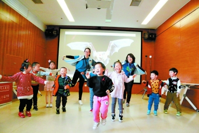 在通州区图书馆,孩子们跟着“故事人”模仿蝙蝠飞行。