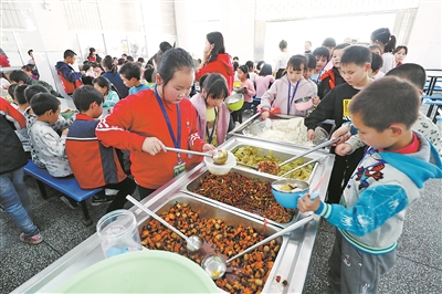 只要1元就能吃上两荤一素加水果的自助餐。湖南怀化漠滨侗族苗族乡学校1180名学生都在学校午餐,学校通过“4+1”模式,抓好学生营养改善计划提质升级。“4+1”模式为学生每天上交1元自筹款,政府补贴4元,精准扶贫户家庭学生自筹款由政府财政拨付解决。此举得到学生、家长一致好评。(本报记者 樊世刚 摄)