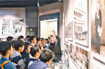 图为4月7日,北京市清河中学学生在八达岭长城脚下的詹天佑纪念馆参观。