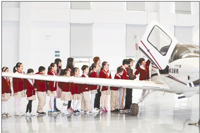 11日,在浙江省湖州市德清县通航制造小镇莫干山机场的四跨标准机库,专业技术人员向学生们普及航天科学知识。