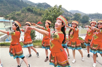 特岗教师和公费定向师范生政策,让一大批师范毕业生走进乡村学校,为乡村教育注入了活力。这是学校青年教师唐柳(中)等在为即将到来的民族文化节排练民族舞蹈。
