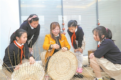 江苏省扬中市新坝中心小学柳编社团学生跟非遗传人学习编织技巧。本报记者 张劲松 摄
