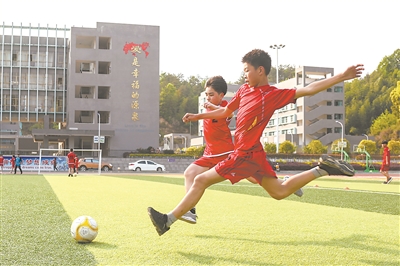 日前,湖北省武汉市英山县思源实验学校绿茵操场上,学生正在进行拦截抢球训练。为了培养学生的足球兴趣,该校开展了“阳光足球大课间”体育活动,倡导全体师生充分享受课间足球运动。本报记者 单艺伟 摄