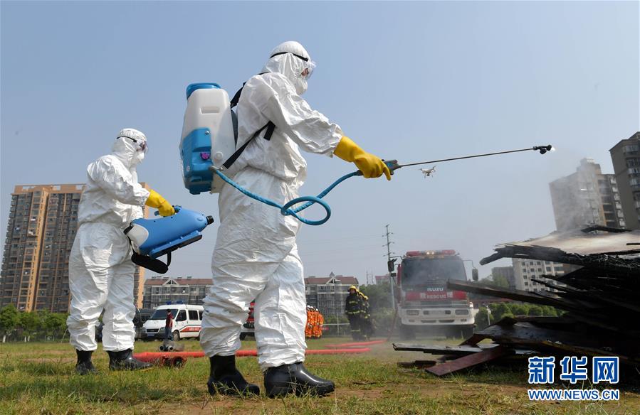 5月10日,参加应急演练的工作人员在模拟灾后防疫。