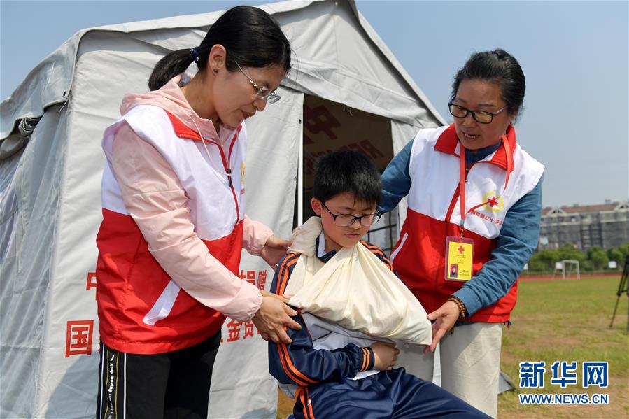 5月10日,莲塘四中的学生(中)和工作人员一同进行现场救护演练。新华社记者 彭昭之 摄