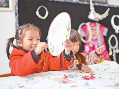 5月14日,贵州省铜仁市松桃苗族自治县盘信镇后寨村幼儿园的孩子们在学习苗绣。