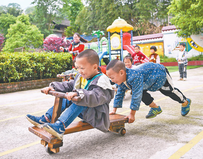 5月14日,后寨村幼儿园的孩子们在玩木制三轮车。