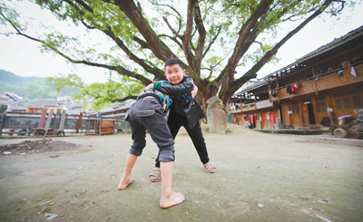 贵州省黔东南苗族侗族自治州黎平县双江镇四寨村是侗族摔跤的发源地之一,从明代末年至今,四寨村祖祖辈辈主要的生活娱乐活动就是摔跤。每年农历三月十五,当地都会举办盛大的“摔跤节”活动,方圆上百里的侗族男女老少都会身着节日盛装来观看摔跤比赛。图为就读于黎平县双江镇中心小学的摔跤小选手吴优(右)在家乡的大榕树下与小伙伴练习摔跤。