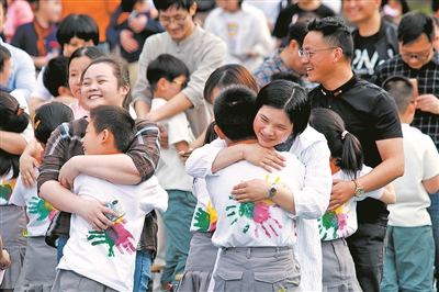 近日,江苏省无锡市扬名中心小学举行“遇见·成长”10岁成长仪式,360余名学生走上舞台,用诵读、舞蹈、歌唱等方式,展现自己健康、活泼、阳光的精神面貌。图为该校学生和家长相互拥抱。汤毅 摄
