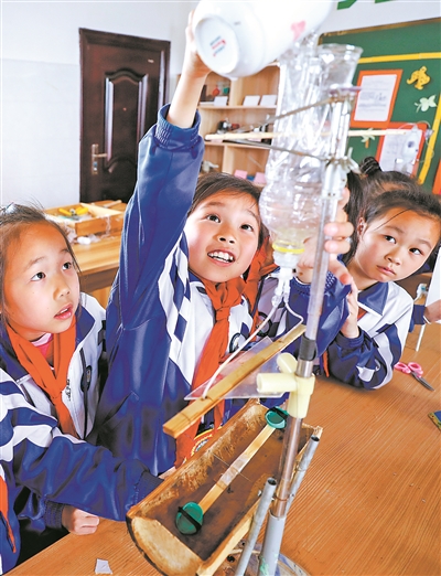 “我来演示滴水跷跷板的原理。”李学战新发明的玩具得到了学生的喜爱。有的学生动手演示,有的学生在一旁分析科学原理,在轻松愉快的氛围中学习知识,科学课成了孩子们最喜爱的课程之一。