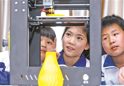 学生正在观看利用3D打印技术打印的花瓶。创客教室里的计算机编程、VR互动、3D打印等,让这些农村娃和城里孩子一样感受高科技的魅力。