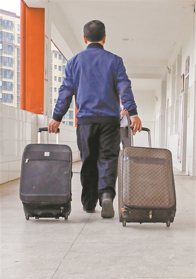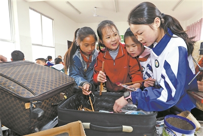 从材料储存室到手工制作室有300米远,每次上课前,李学战便会拉着两个旧行李箱走进教室,箱子里装满了各种各样的材料,被学生称为“百宝箱”。