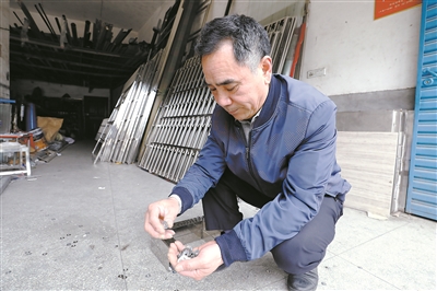 每天早晨或是傍晚,李学战便会骑着自行车寻找可以利用的废旧材料。他经过一家门窗加工店时,老板已经认出了这个老熟人,热情地邀请他进来寻找一番,地上废弃的小垫片此刻成了李学战的宝贝。
