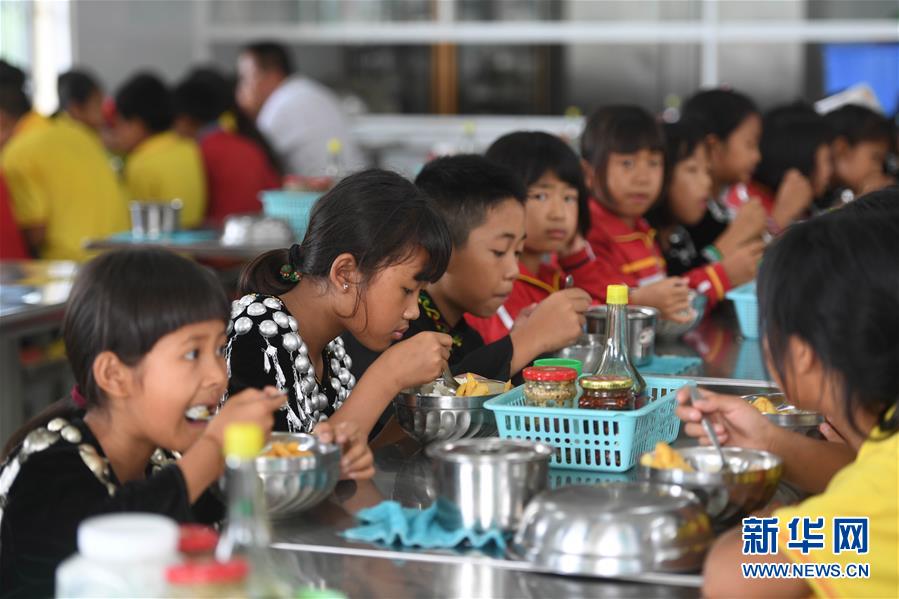 6月21日,在芒市西山乡营盘民族小学,学生们在午餐中。新华社记者 秦晴 摄