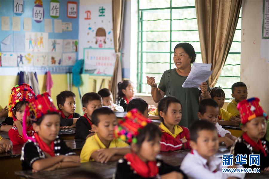 6月21日,在芒市西山乡营盘民族小学,老师董木兰(右)在给学生们上课。新华社记者 秦晴 摄