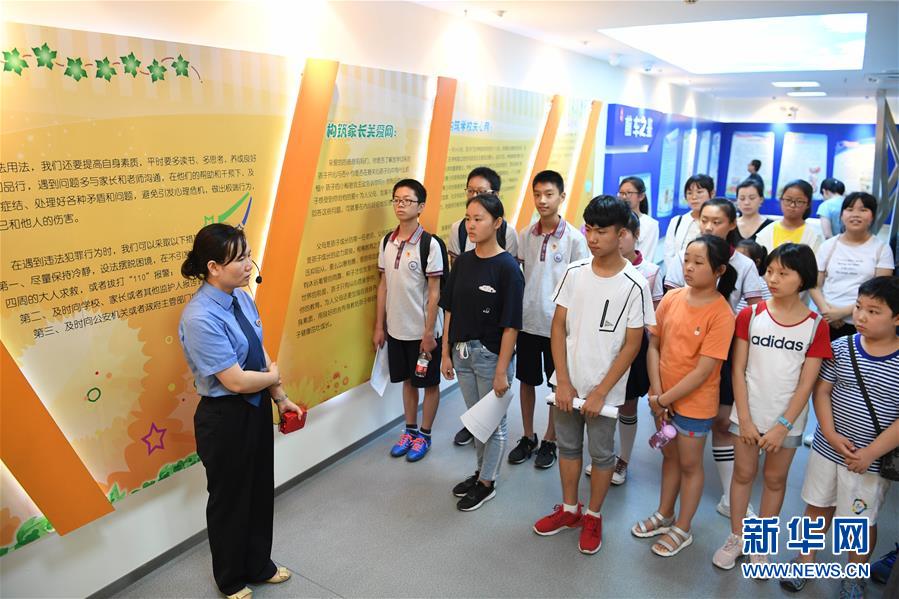 7月4日,孩子们在包河区人民检察院未成年人法治教育基地里参观。 当日,安徽省合肥市包河区常青街道开展普法夏令营活动,组织辖区青少年来到合肥市包河区人民检察院未成年人法治教育基地,通过普法宣传和模拟法庭等环节,增强孩子们的法律观念和守法意识。 新华社记者 刘军喜 摄