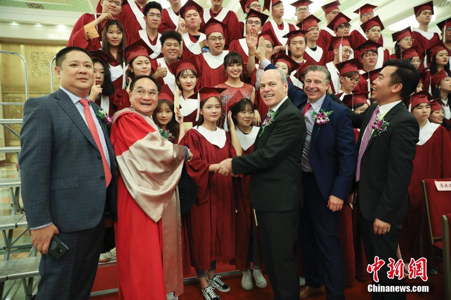 7月6日,中加学校在北京人民大会堂举行毕业典礼。图为中加学校董事长彭建华(前左二)、加拿大驻华大使馆代办Jim Nickel(前右三)等嘉宾和毕业生们交流。中新社记者 赵隽 摄