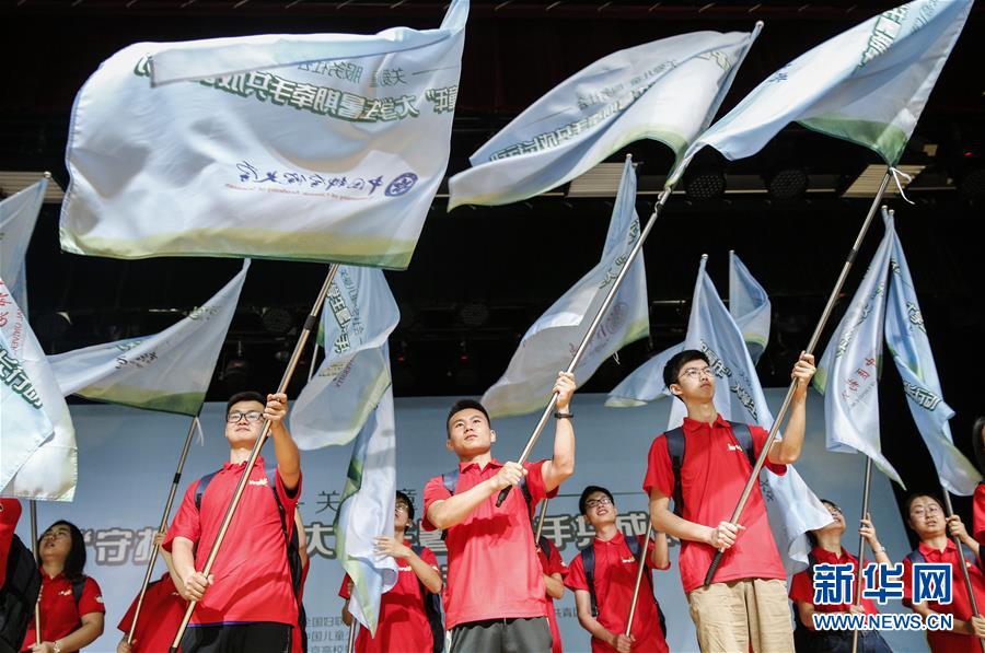 7月10日,高校志愿者代表在启动仪式上挥舞旗帜。新华社记者 张玉薇 摄
