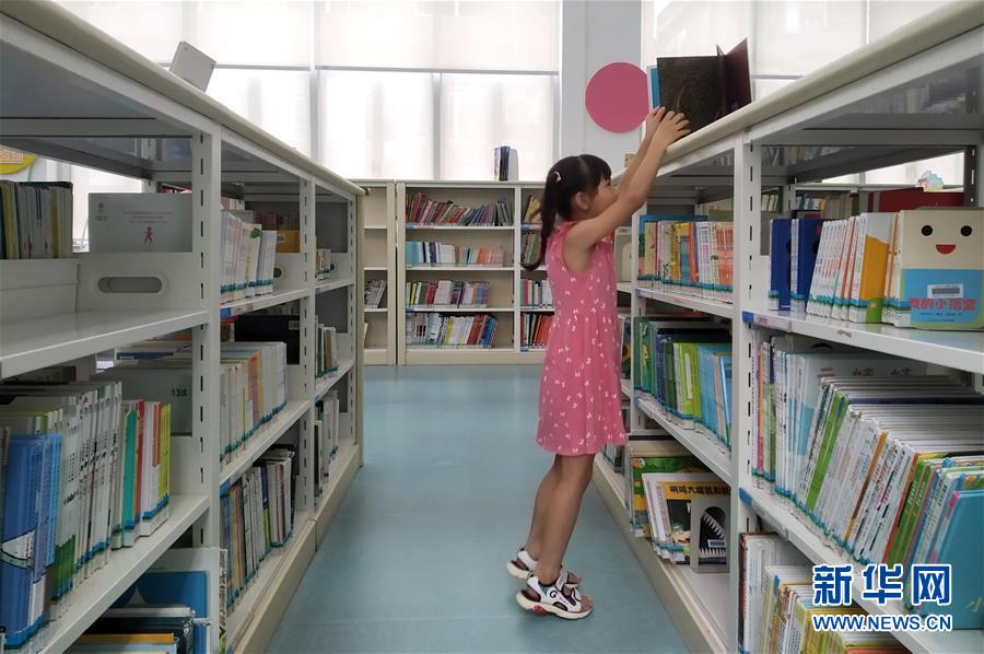 7月25日,一位小朋友在广州少年儿童图书馆的书架前看书。 暑假期间,广州少年儿童图书馆迎来了人流高峰,不少小朋友来到图书馆里阅读书籍,丰富暑假生活。 新华社记者 卢汉欣 摄