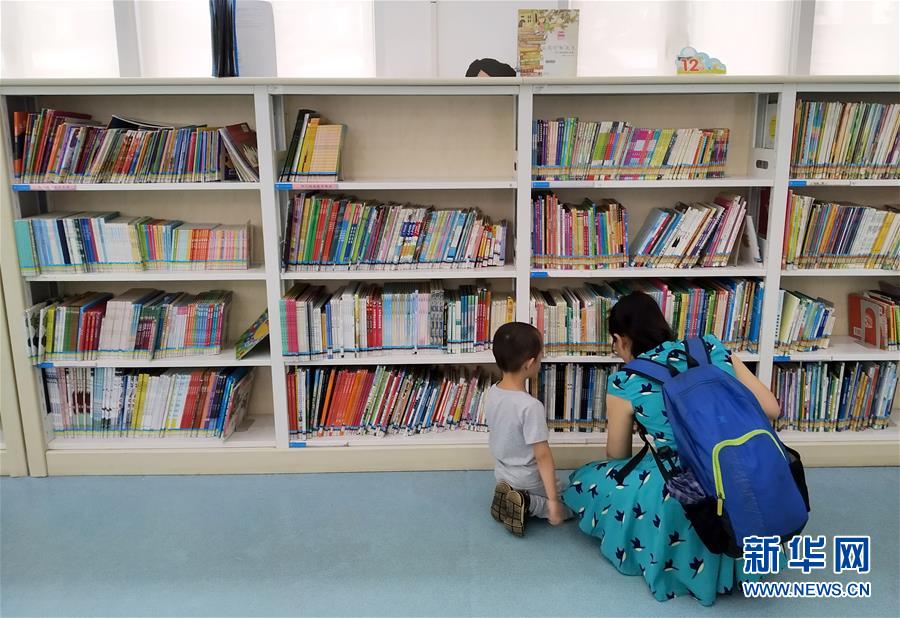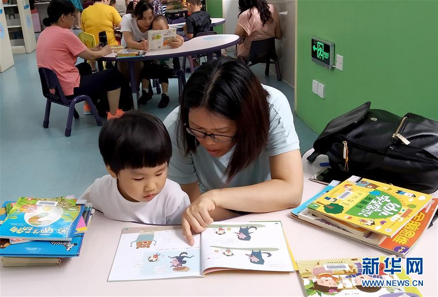 7月25日,在广州少年儿童图书馆里,家长在给孩子读绘本。 暑假期间,广州少年儿童图书馆迎来了人流高峰,不少小朋友来到图书馆里阅读书籍,丰富暑假生活。 新华社记者 卢汉欣 摄