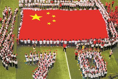 学生们在巨幅国旗旁组成“70”字样队形。广州日报全媒体记者庄小龙/摄