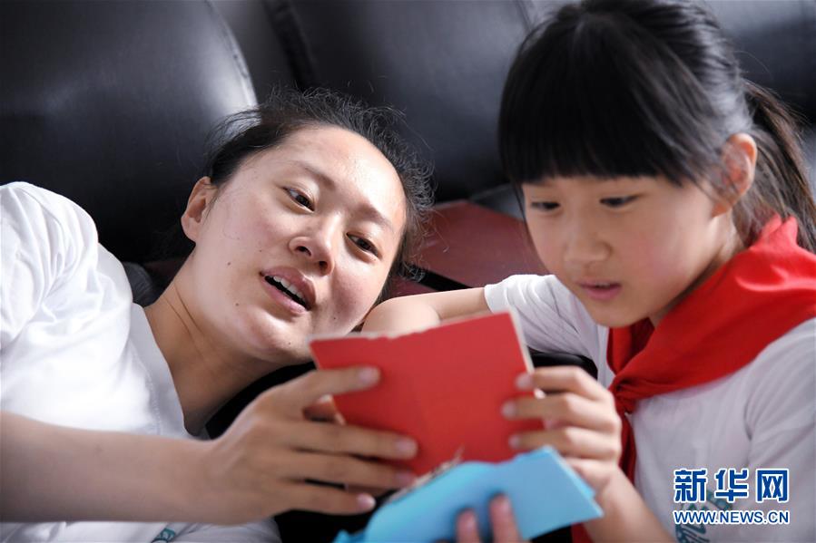 已有七个多月身孕的张丽课间躺在沙发上休息,女儿杨焱喜在为她选读毕业班学生送的感恩卡(6月26日摄)。新华社记者 李紫恒 摄