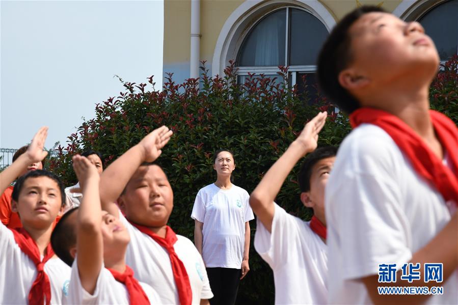怀有身孕的张丽精神饱满地和青岛西海岸新区灵山岛学校师生一起升旗(6月26日摄)。新华社记者 李紫恒 摄