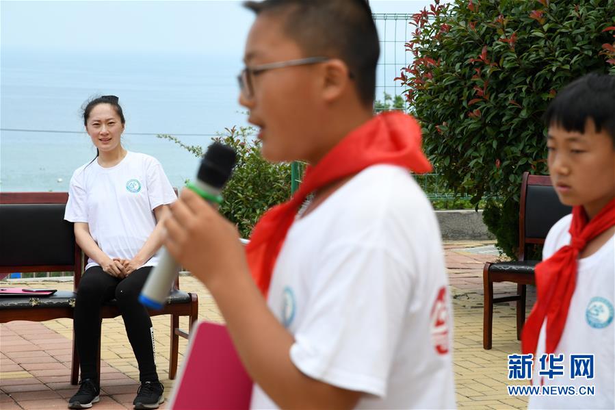 在青岛西海岸新区灵山岛学校的毕业典礼上,张丽在一旁听着毕业学生们唱《感恩的心》(6月26日摄)。新华社记者 李紫恒 摄