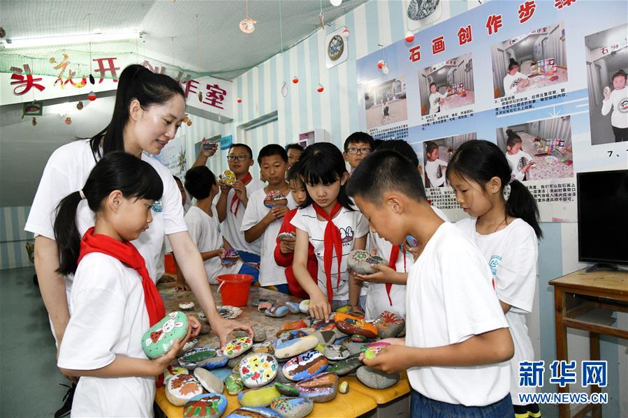 在青岛西海岸新区灵山岛学校,张丽和学生在“石头花开创作室”挑选参加“全国知名海岛品牌学校”展示所需的石画(6月26日摄)。新华社记者 李紫恒 摄