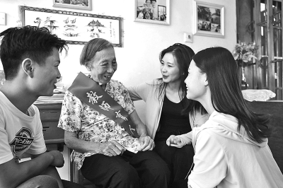 今年90岁的许兰芬,曾是江西省高安中学的老教师,45年的教学生涯,育得桃李满天下,在第35个教师节来临之际,她被授予“教书育人楷模“。图为许兰芬的学生来家中看望她,师生相聚、欢声笑语。李莉摄/光明图片