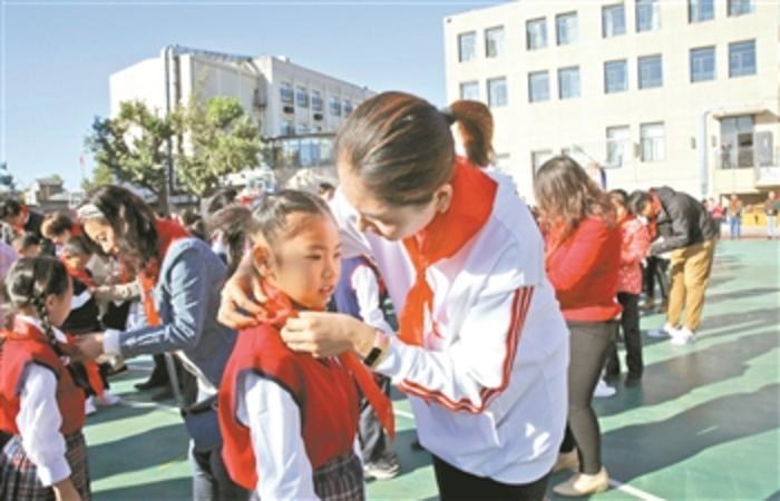 当日,该校举行“争做新时代好队员”主题队日暨新队员入队仪式,学生们戴上红领巾,加入少先队。
