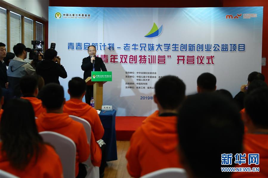 11月1日,中国儿童少年基金会秘书长朱锡生在开营仪式上致辞。 当日,由中国儿童少年基金会联合老牛兄妹基金会等发起的青春启航计划——老牛兄妹大学生创新创业公益项目“青年双创特训营”在北京正式举行。 “青春启航计划”旨在为大学生特别是女大学生提供精准就业服务,探索形成政、企、社、校多方协同解决大学生就业创业问题的社会化模式。目前,项目已为包含25万名女大学生在内的45万余名大学生提供能力测评。 新华社记者 张玉薇 摄