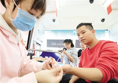 11月17日是世界大学生日,湖南省衡阳市南华大学衡阳医学院在19级大学新生开展“献第一次血,过第一个大学生节、履第一次救死扶伤责任”的志愿无偿献血活动。图为南华大学衡阳医学院2019级新生在献血车上验血。曹正平摄/光明图片