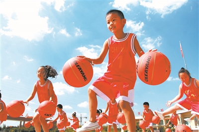 山东潍坊高密市恒涛双语学校学生在表演自编的篮球操。孙哲 摄(资料图片)