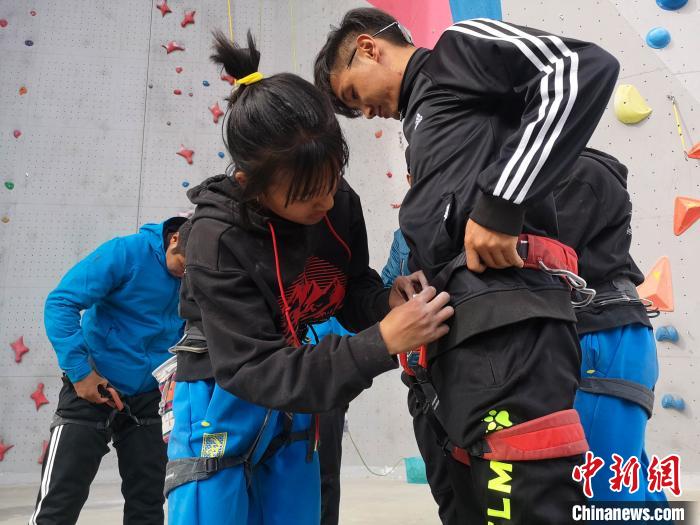 图为攀岩教练为受训人员穿戴装备。 赵朗 摄